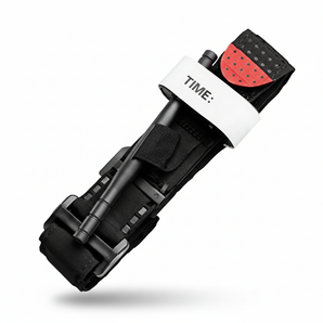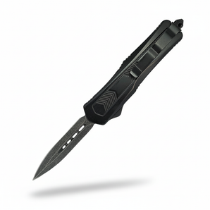Baston Retráctil Automático MEGA Un bastón retráctil eh con mango anti de rapante en color negro con rompe cristales en la parte inferior del mango de apertura automática con seguro y sus características siendo señaladas por flechas en color rojo señalando la punta plana la extensión en 2 piezas el mango con diseño anti de rapante el seguro de apertura y el rompe cristale